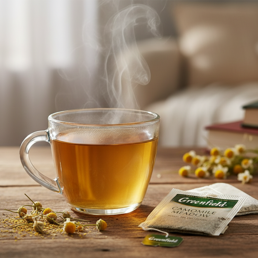 A gentle chamomile herbal tea with a soft floral aroma, offering natural calm, warmth, and a soothing, relaxing taste in every cup.